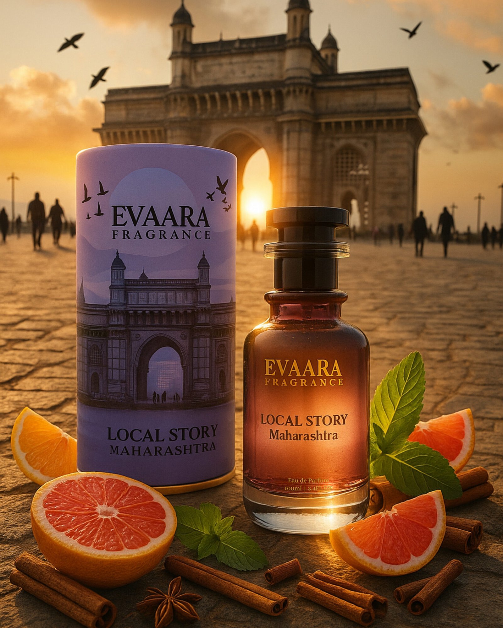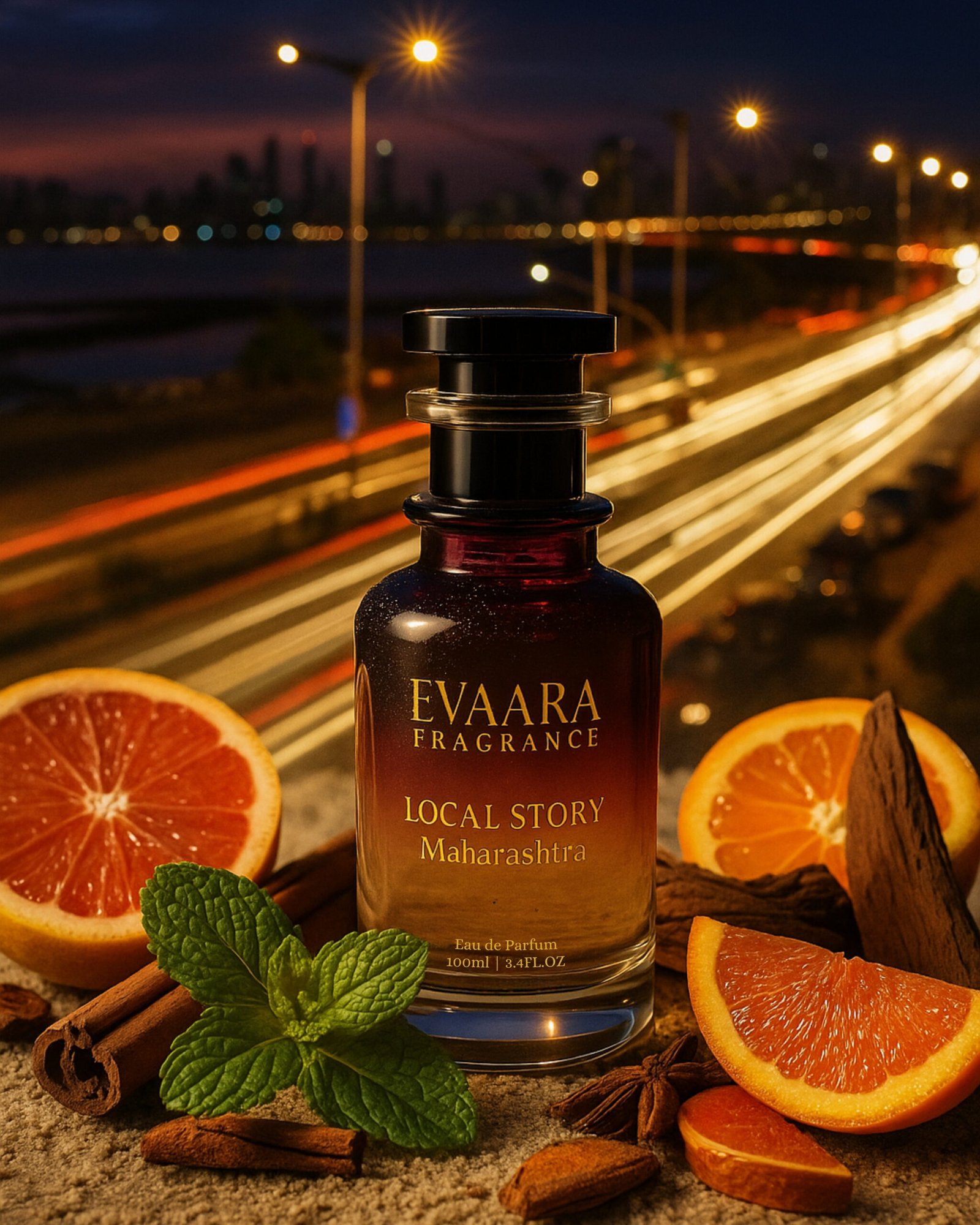 Fresh grapefruit, mint, and blood mandarin lead you into the spice of rose, cinnamon, and clove, before grounding in patchouli, leather, and deep woods. Maharashtra in a bottle: strong, diverse, unapologetically bold